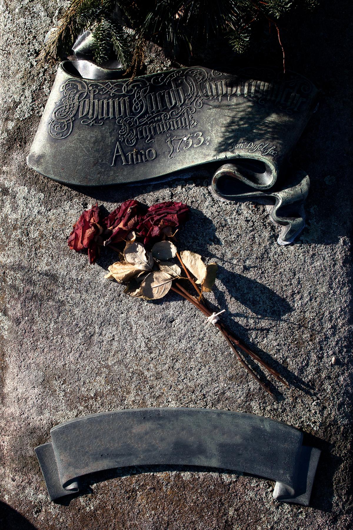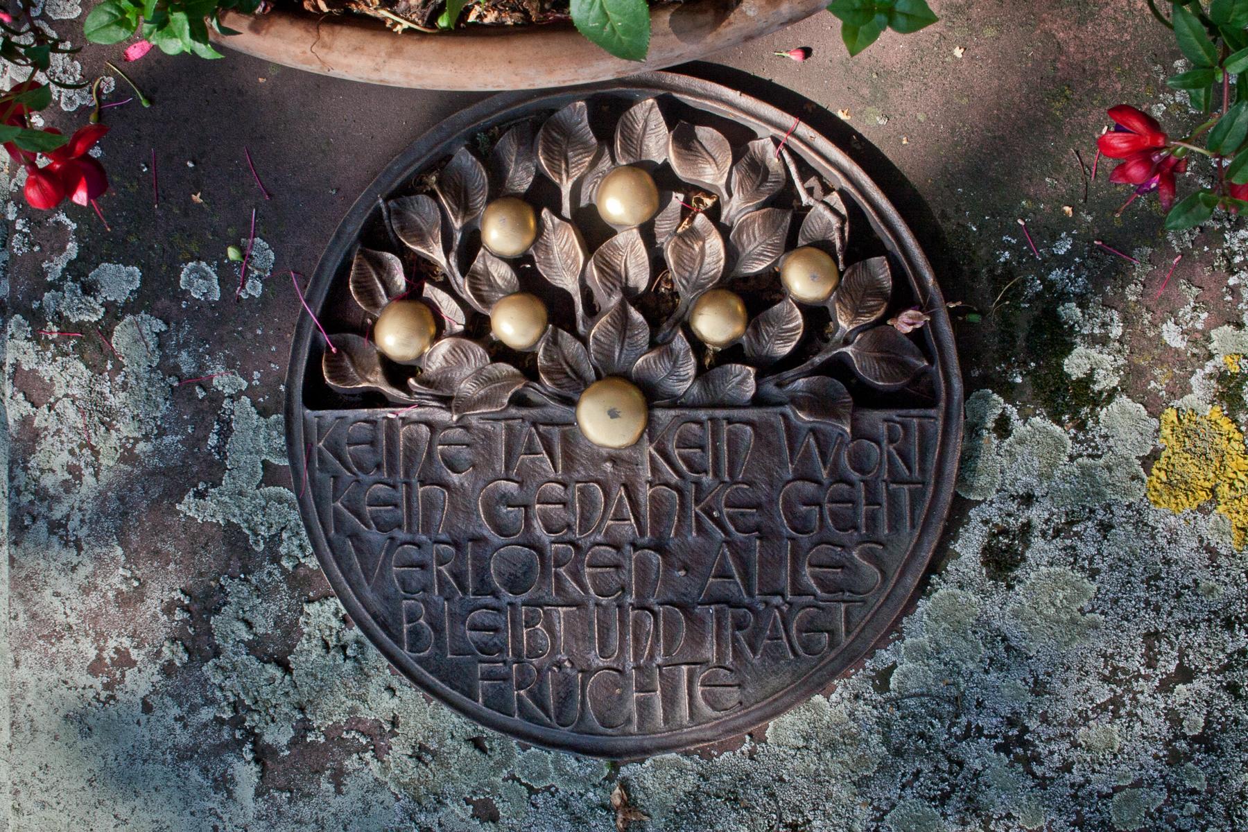 Bilder vom St. Johannis und St. Rochus Friedhof zu Nürnberg: Bronzene Grabtafeln mit individuellen biografischen Botschaften